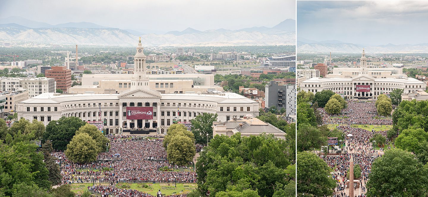 Hundreds of thousands of fans lined the streets of Denver to celebrate the Colorado Avalanche, winners of the 2022 NHL Stanley Cup. Made up of people from all walks of life, and especially a large number of families and children, the energy was electric. To help show the size, these first images were taken from the dome of the Denver Capital building, 99 steps above the 3rd floor:
