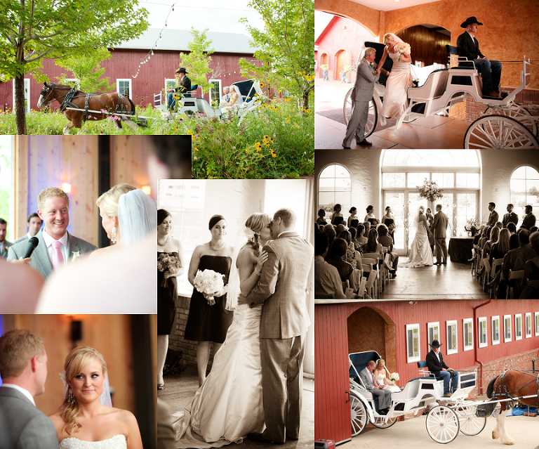 Because of the rain, the ceremony was moved indoors, but it didn’t stop one of the neatest aspects of the day…Christy and her dad enteredon a carriage! The clydesdale marched right into the room, dropped her off, waited during the ceremony and then led the carriage with Christy and Jason out the opposite door!