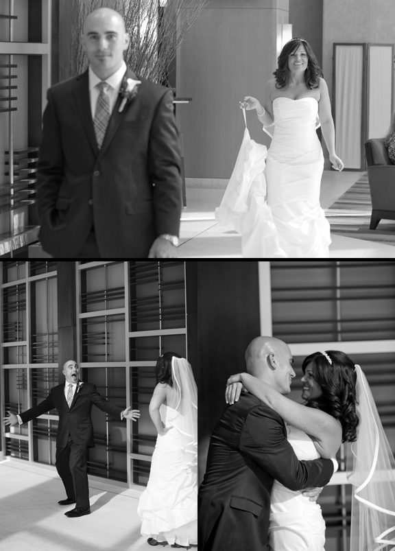 I would never talk a couple into seeing each other before the ceremony if they have the desire to wait until the bride walks down the aisle.. However, I LOVE it when they choose to see each other before the ceremony!!! There are a couple of reasons for this. First of all, it’s a neat and emotional moment! When everyone is standing to welcome the bride into the ceremony, it’s tough to get a great picture of both bride and dad walking down the aisle, and the groom’s expression when seeing her for the first time…Not impossible, just tough. Whereas, if they see each other BEFORE the ceremony, I can carefully arrange the lighting and situation to capture some amazing moments. (Another great reason is that it frees the schedule a bit by taking the family pictures before the ceremony and not missing cocktail hour…) The reaction and expression on Tom’s face when he turned around to see Emily for the first time is priceless: