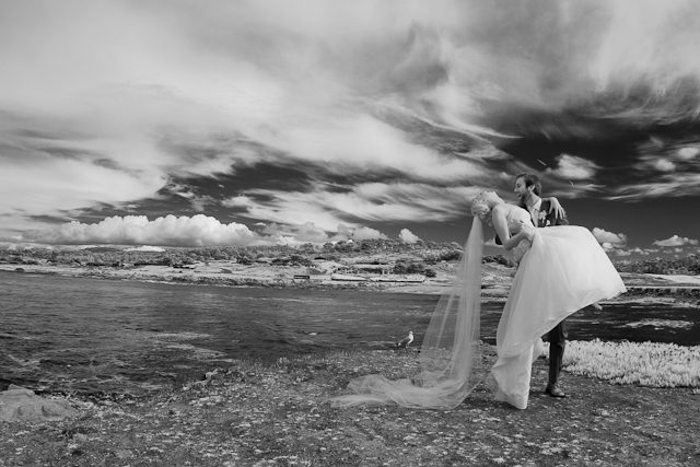 The third camera body is my ‘artsy’ camera.  It is a Canon 20d that I sent in to the company Life Pixel to have converted to capture Infra Red images.  It’s a different wavelength of light than what the human eye sees and can make for a dreamy, ethereal image…Especially in bright sunlight on a day with blue skies and big clouds! Here’s a recent wedding image taken with this camera: The lenses take up a good portion of the rest of the bag.  I have five: